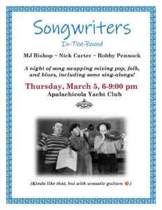 I am very excited for this upcoming show at the Apalachicola Yacht Club in Apalachicola, Florida.  I’ll be joined by my fabulous friends MJ Bishop and Nick Carter who are both wonderful singer/songwriters.  This is going to be a lot of fun!
